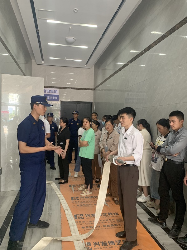 在生動有趣的消防安全培訓結束後,消防支隊專家與集團全體員工到大廈一樓進行實地演練,消防支隊專家們逐一介紹滅火器材和消防水帶的使用方法及相關注意事項。集團員工在認真聽完介紹後主動實踐,将理論知識内化于心,實踐于行。
